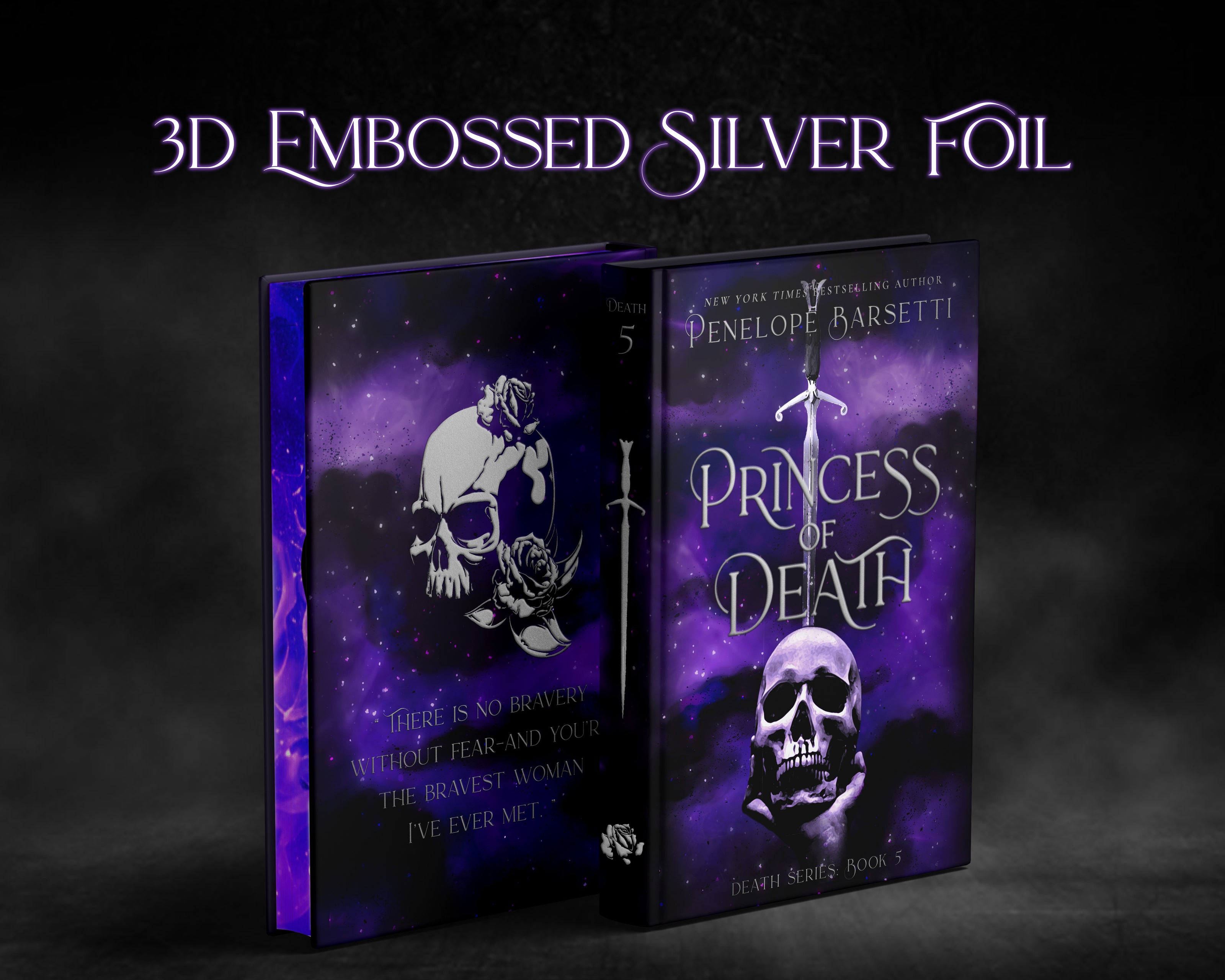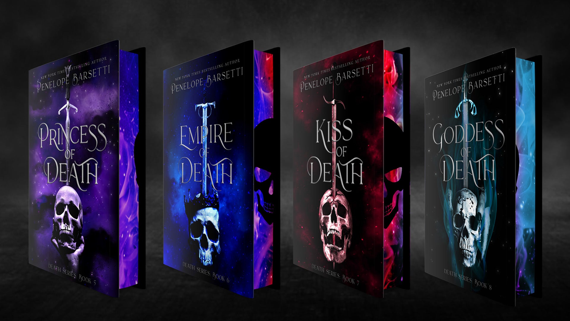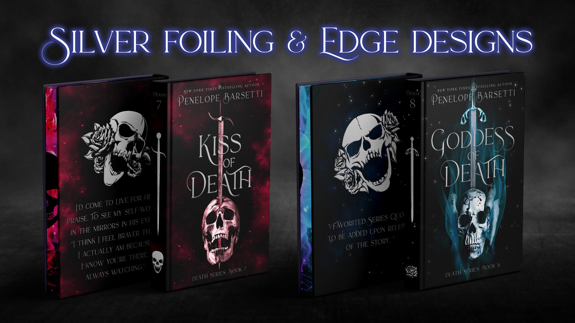 Continue the dark and seductive world of the Death Series with the hardcover special editions of Books 5-8. Featuring stunning 3D embossed silver foiling, mesmerizing skull edge designs and artwork, and Penelope's signature, these editions elevate your reading experience into a work of art. These collector’s items will pair perfectly with the first set while still standing out on your shelf.