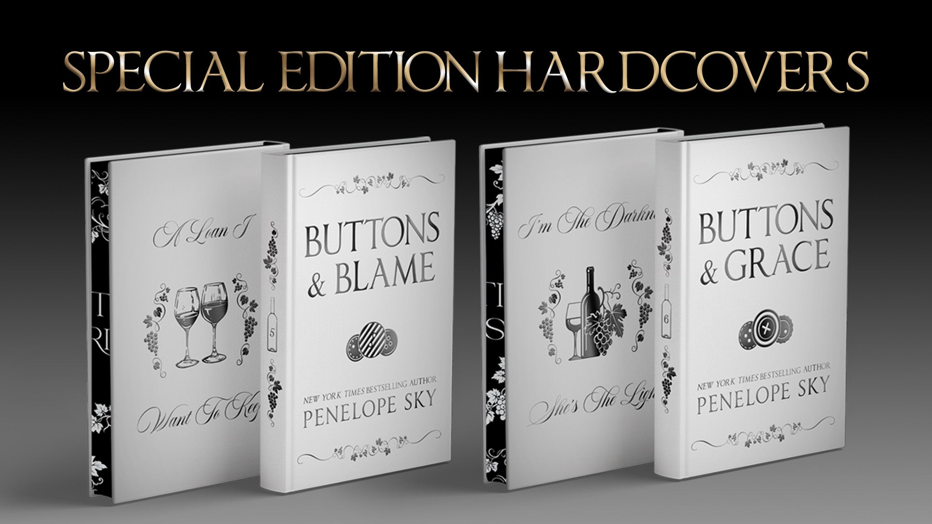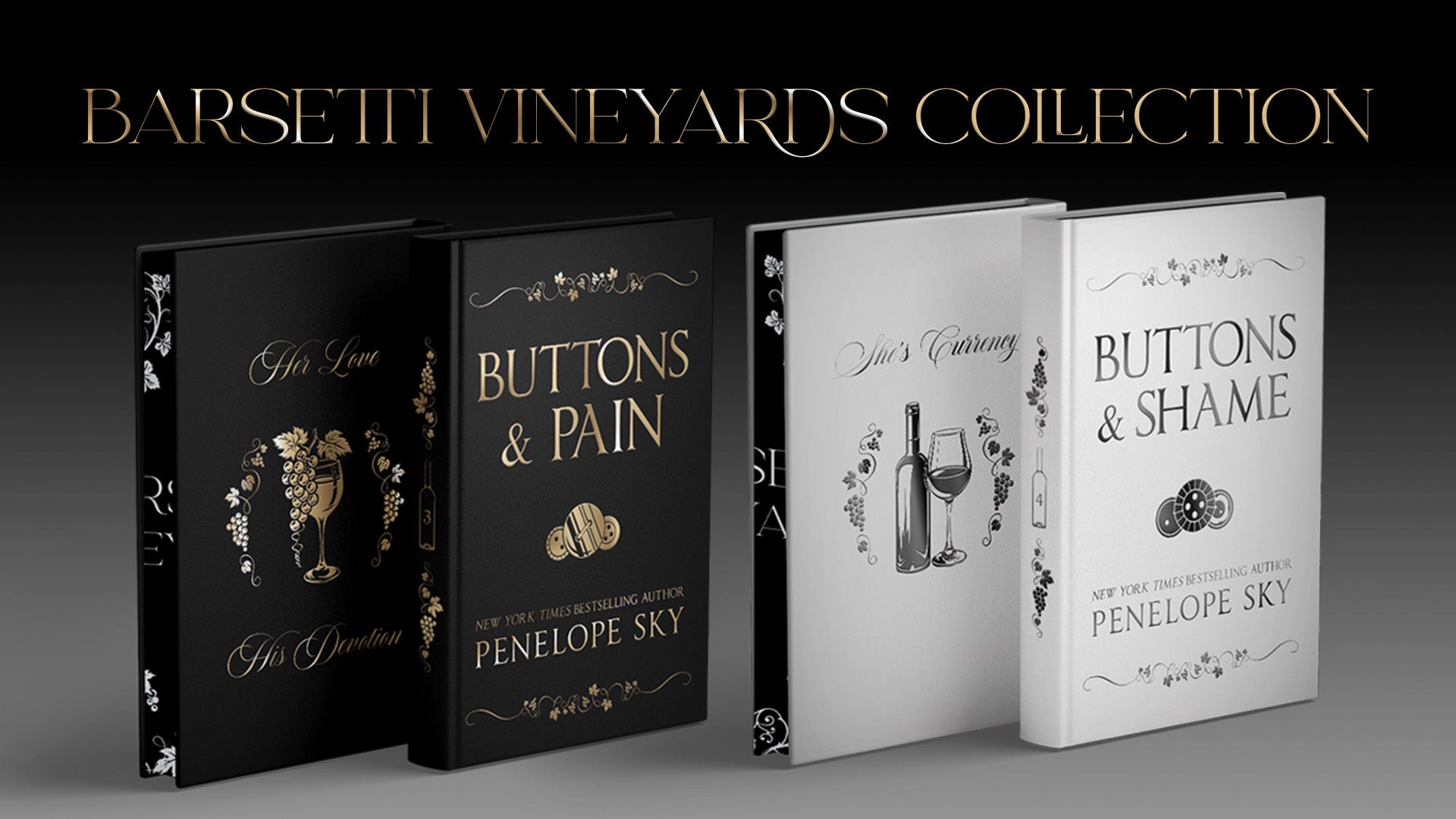 The Buttons Series: Barsetti Vineyards Collection brings Penelope Sky’s most beloved dark mafia romance to life in stunning, elegant hardcovers made for collectors. Designed to honor the Barsetti legacy, these special editions exude dark sophistication with embossed foiling, vineyard edge designs, and more.